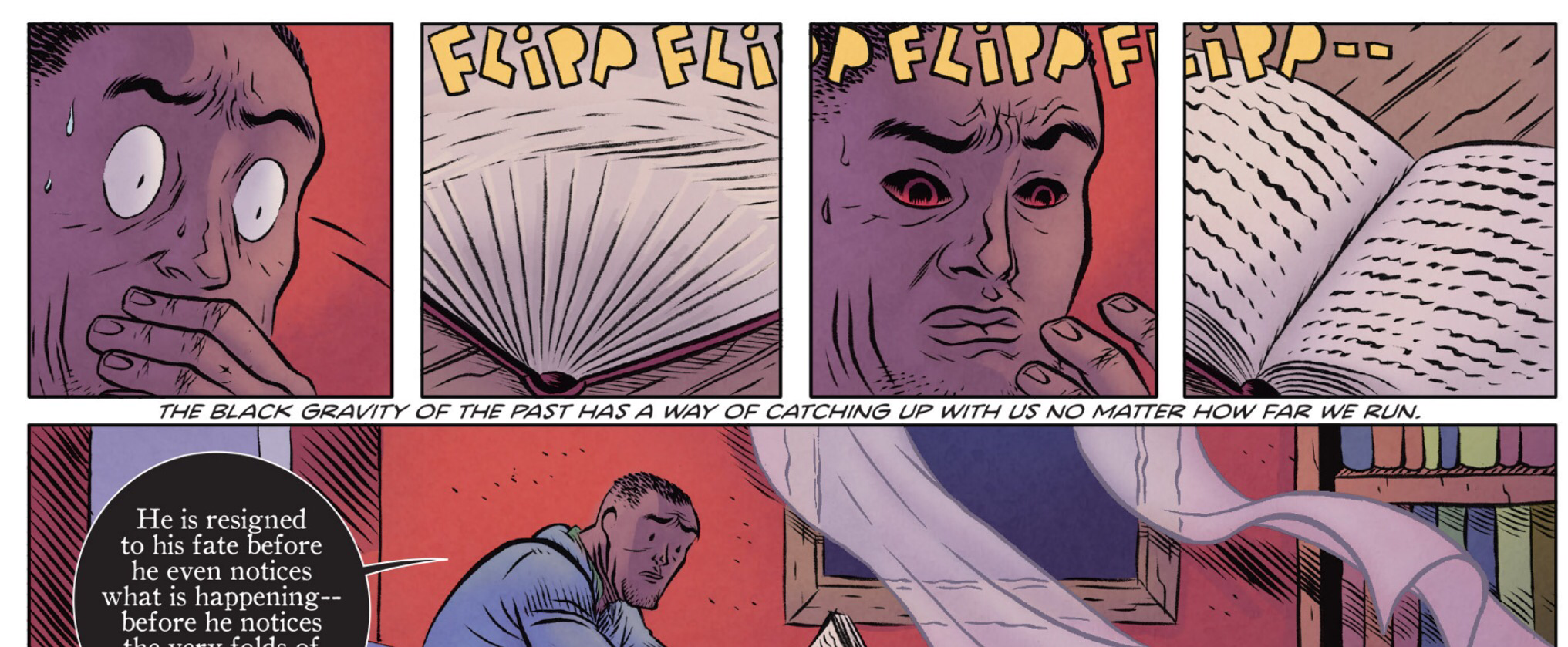 What I really love about The Fiction are the panel transitions, the flow of the sequential art. The transitions from panel to panel are masterful. A great use of how the line of sight follows, creating an illusion of motion. The size and frequency of the panels helps the mood. I love it all in the grand display from start to finish, as I think this style is not used all too often. But sweet, when pulled off well..