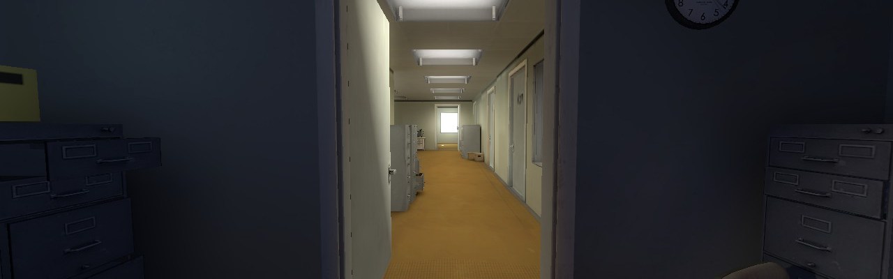 So that is the joy of The Stanley Parable, which leads into the aesthetic look and feel of the game. There is emptiness, perhaps an unease on the loneliness of it all. The narrator provides a little company, with wit at times. An almost bonding happens, which for the sake of the stories saves Stanley from suffering of an existential nightmare. Some endings there is a sense of company..which may not be better. For the best ending, Stanley should be truly happy and free..which can be questioned by the player.