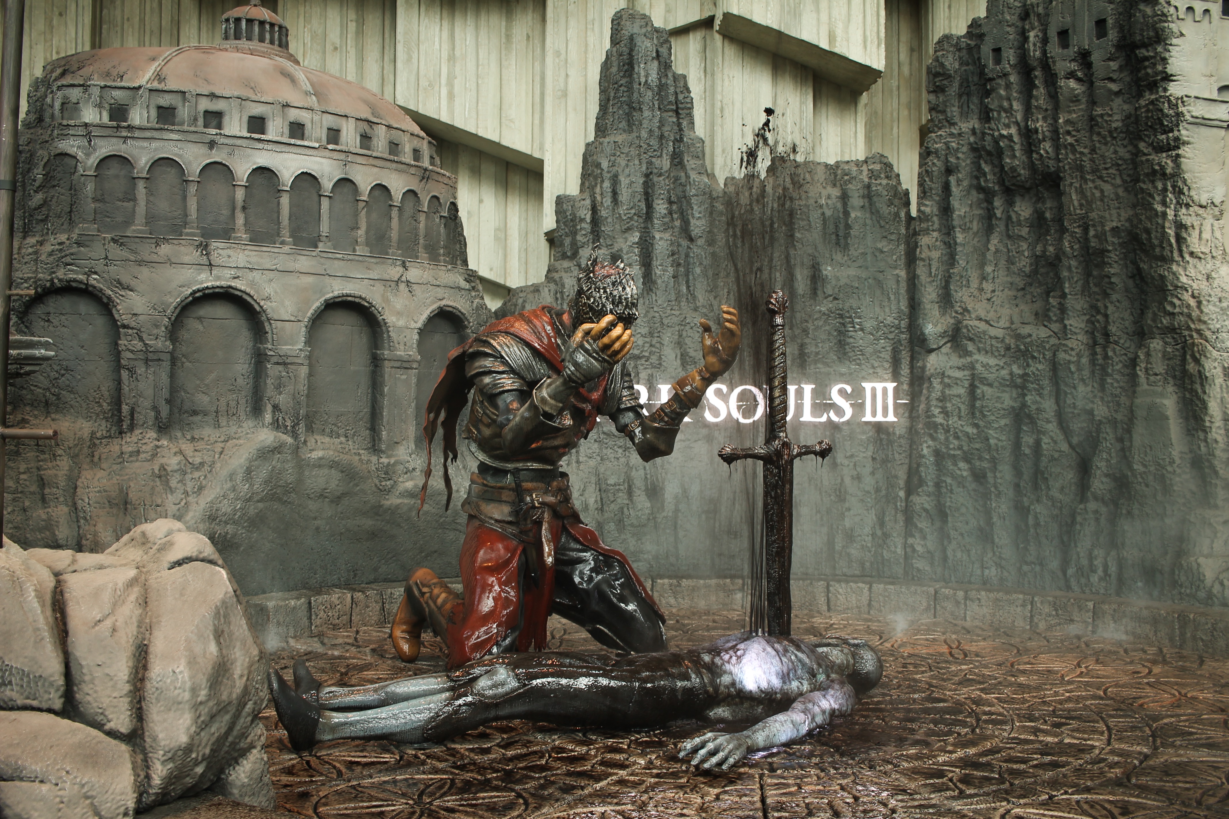 The Dark Souls III fountain display at the front entrance. Notice the cool blood effect..