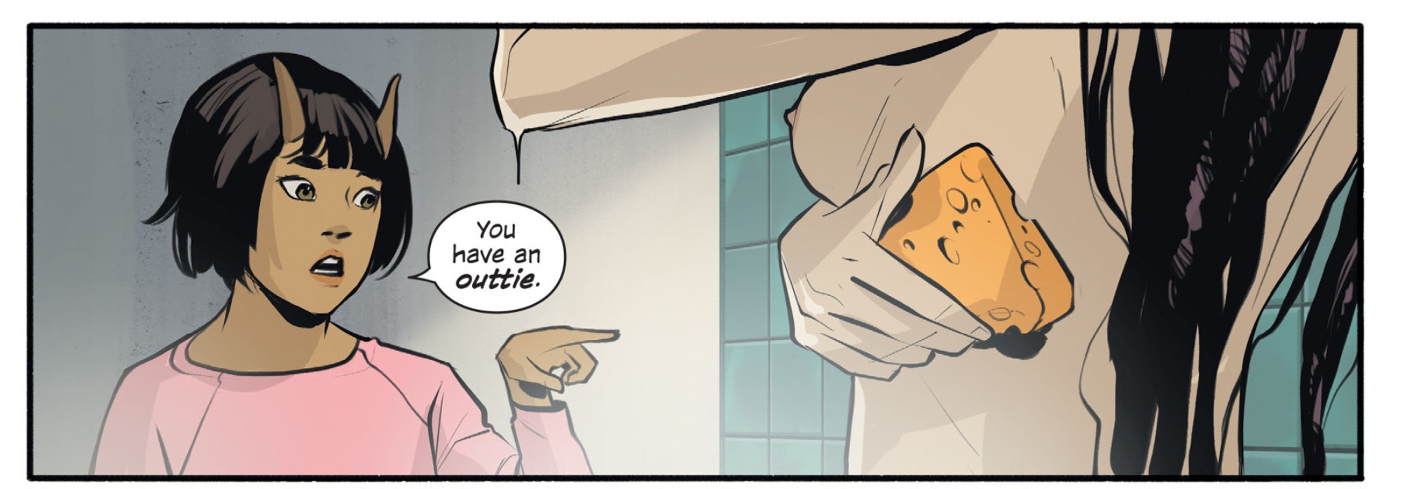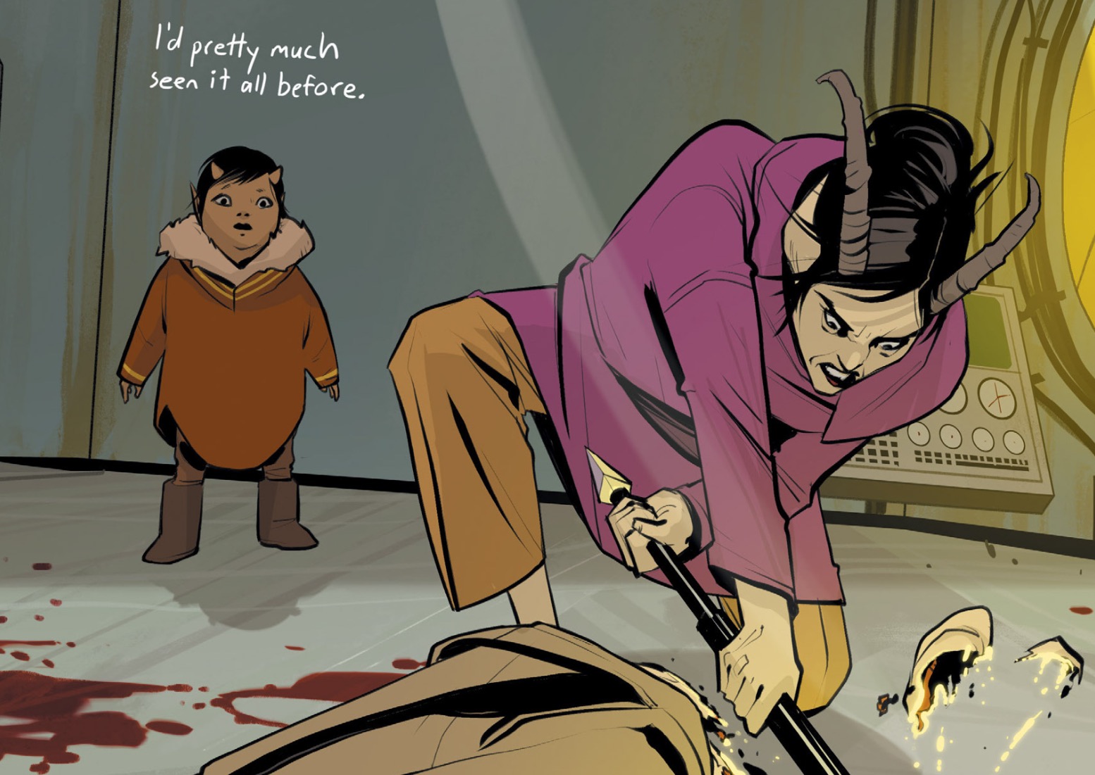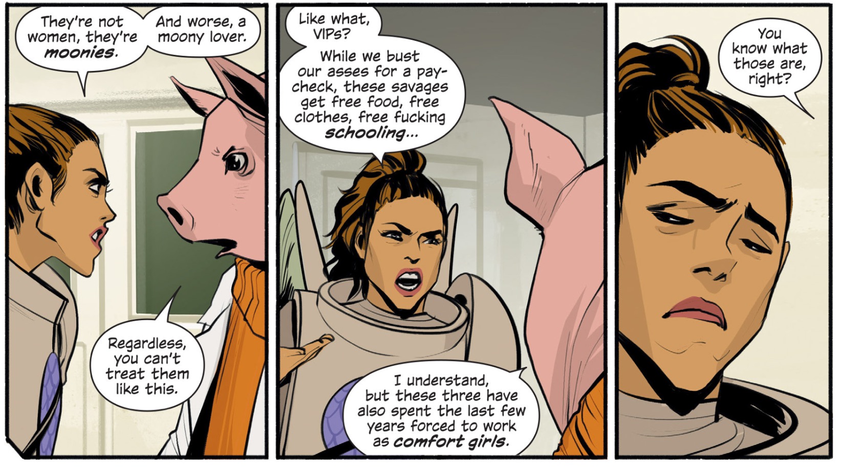 While that part of the story is a flashback, it’s a good one relevant to how I think her character will develop. We see again the violence exposed to for Hazel, with two crushed heads in one issue. It’s brutal for any child to absorb, but she seems a little desensitized to it by then. Upon seeing others of her kind later before entering the showers, she seems still unaffected by the obvious violence to her kind that still persists. There are some other troubling themes I see she has gotten accustomed to, being extraterrestrial racism which is more distinct here, being that we see a lot more than the “Wings” and the “Moonies”. Here, I suppose it’s more about history and entitlement from the Landfallian perspective.