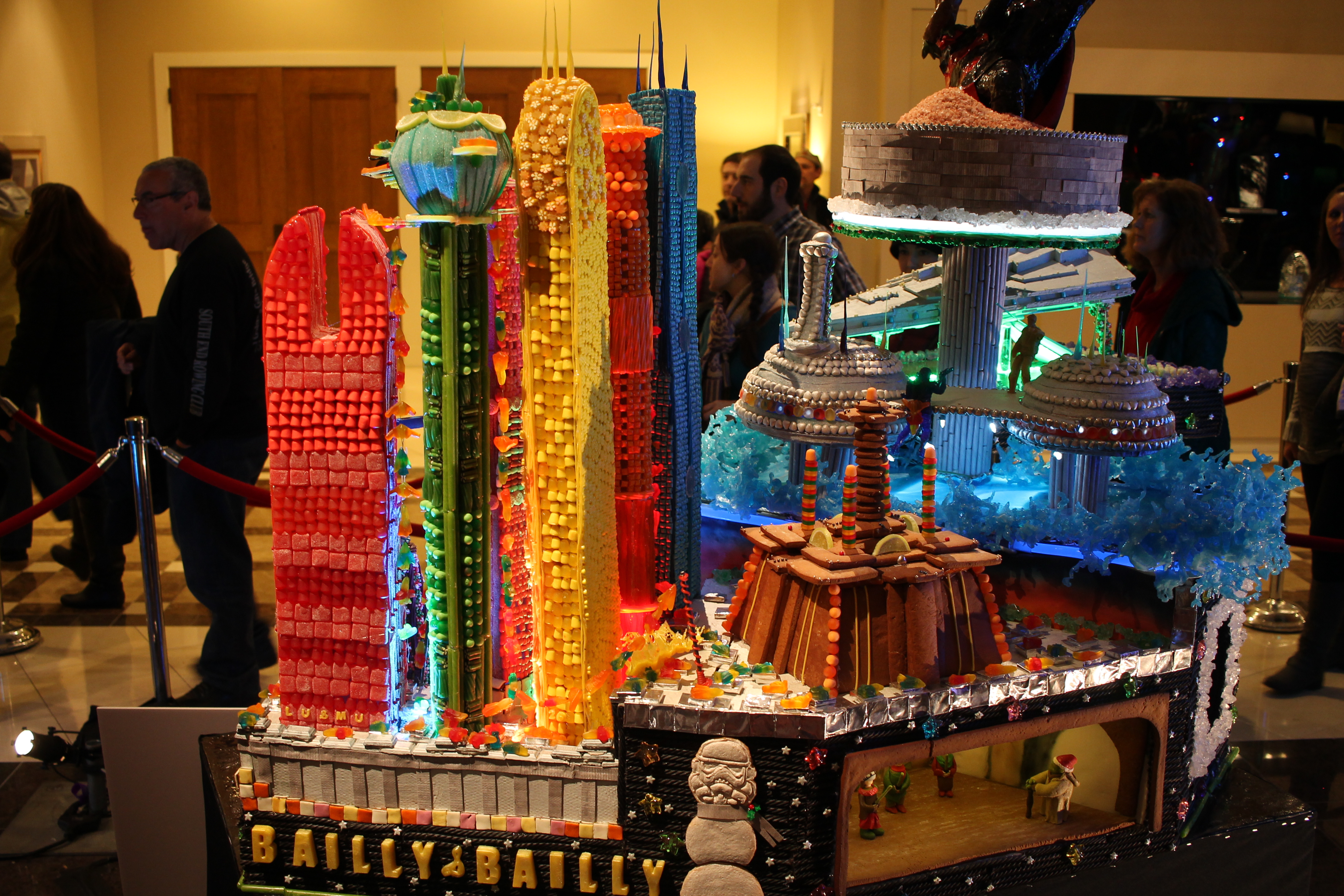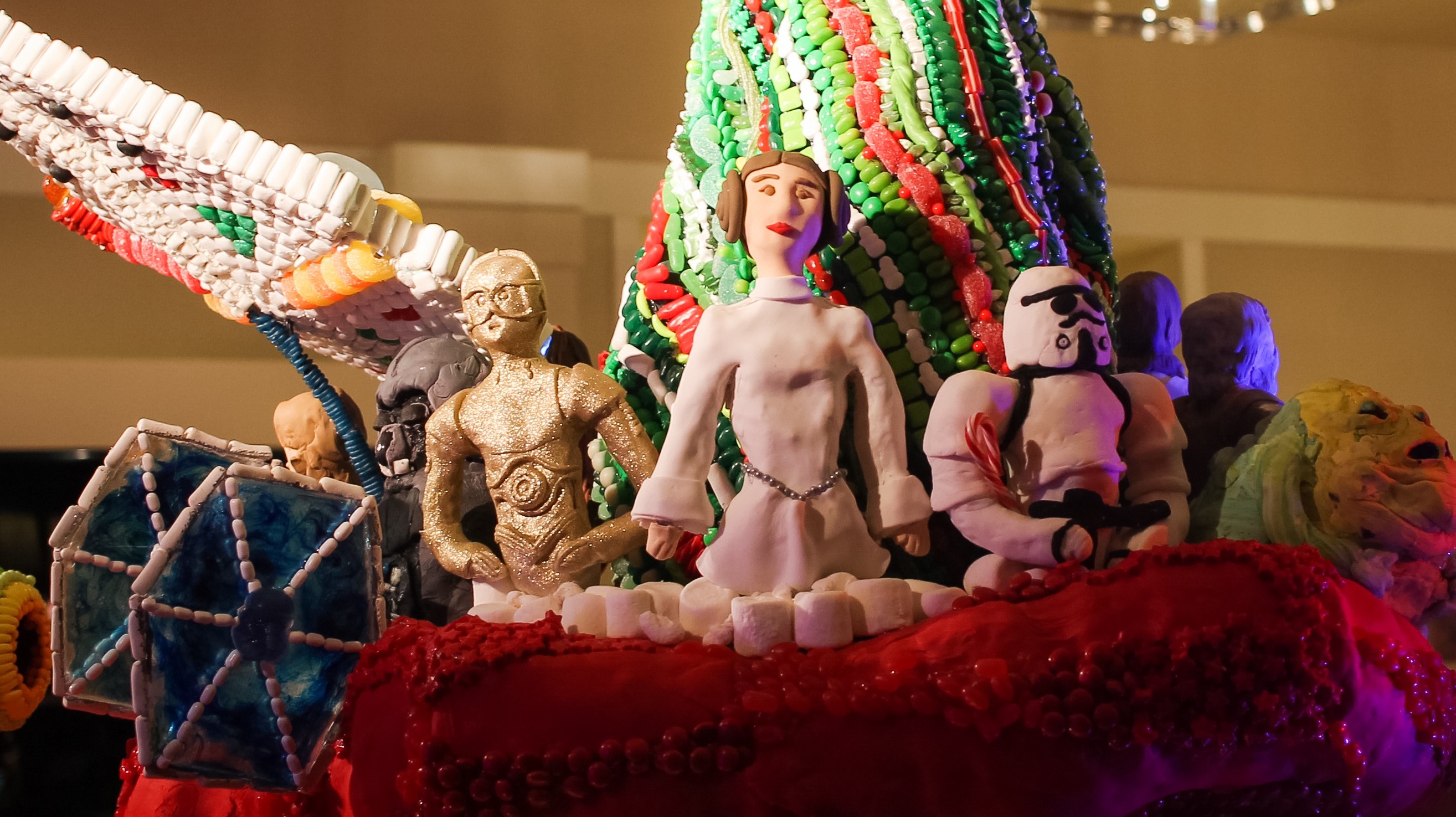 Pictured below, are huge Star Wars movie themed displays with exteriors made mostly out of reinforced gingerbread, frostings, candy bits, lots gummies, and a gazillion other sugary bits and bites. Each display developed from the work of an architecture firm and lead “chef.” Also involved were children (aka “Elves”) dealing with Type 1 Diabetes, promoting the cause of the Juvenile Diabetes Research Foundation (JDRF) for treatments and research.