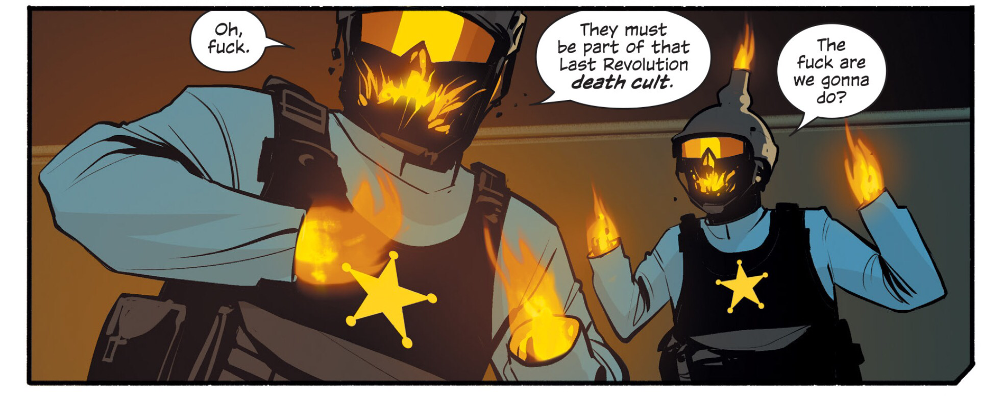 The artwork as usual is splendid and consistent, as usual. I find the design of the fire elemental guards as fantastic and awesome, not sure why; I would definitely consider having little action figures of them if Saga had or would have such a product line. Otherwise, nothing too eye-opening except for perhaps the straight forward nudity..at this point shouldn’t bother anyone. I can’t help but laugh though, should someone find this comic lying around in a stack of Spider-Mans or something of that. But such genitalia presented is a pleasant reminder of how unrestrained the storytelling is, through the artist choice of visuals.