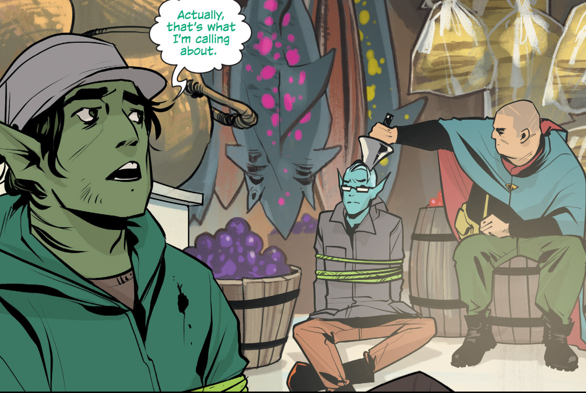 First off, some debauchery with sex and space drugs, and Lying Cat?! Or is it a lying cat? There are hints about what exactly is going on, over the phone with the Will. We shall see, but the crown is an interesting touch to perhaps what other developments we may have missed. Also, I loled at how The Will holds his lance weapon to the back of Upsher’s head.