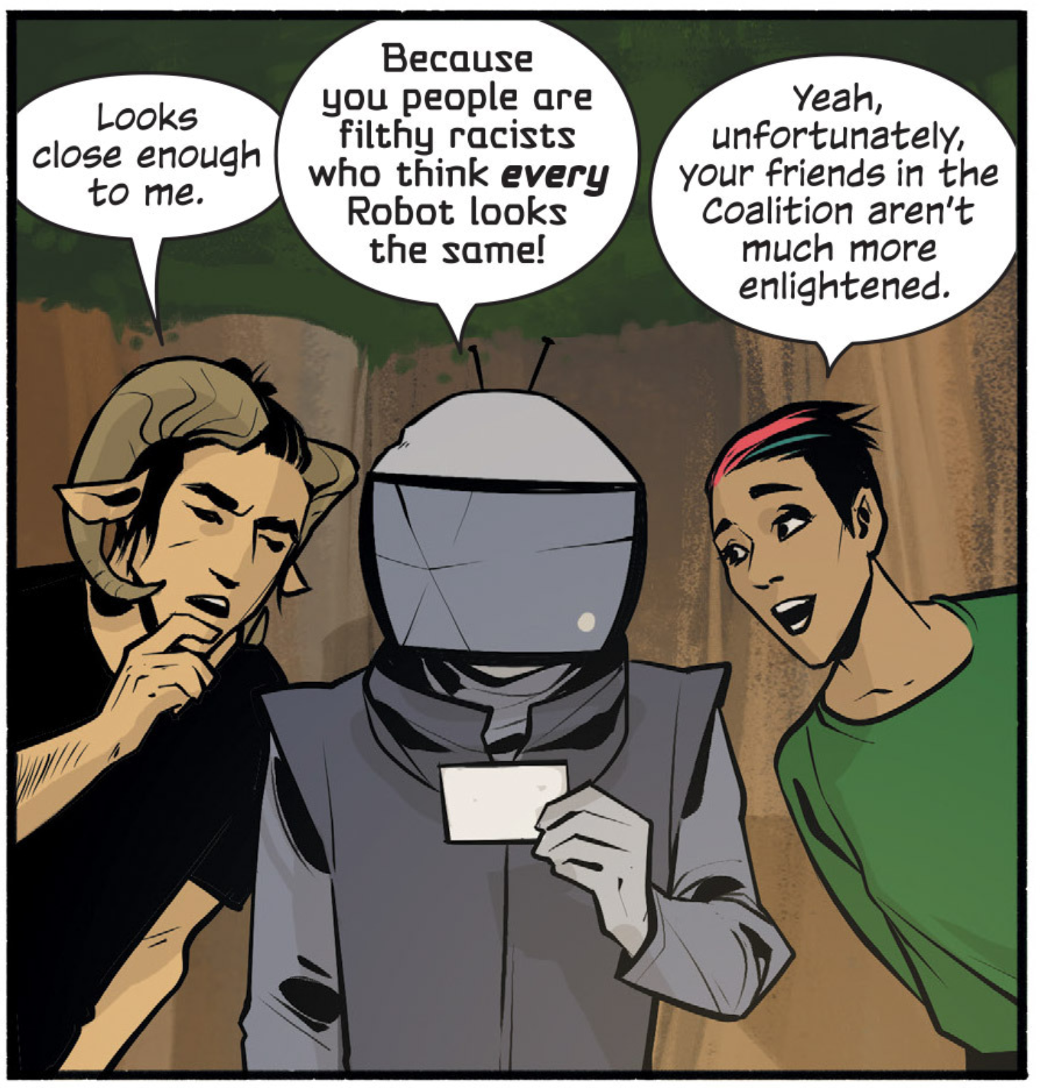 On a side moment, I love the absurdity of Robot calling others on racism, or perhaps how all robots with televisions as heads look the same..maybe to us they do. But to them probably not, as Alana points out. Still, there are moments like this that remind me like the Ducks in Disney, such is more based on familiarity by subtle differences in expressions. I would love to see how well we could recognize Robot among others of his kind. Such would be an interesting task for the artist and writer, I think.