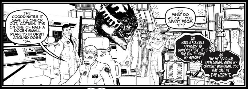 Brian Haberlin: The tagline is “Everyone has a dark side, his has its own wardrobe.” We also have some free Faster than Light stories on the website (See the Mission Logs here). The first one is “The Hermit” story on our website, which is available on the black and white ashcan here (at the convention), and every month a new black and white issue, focusing on a single character. First one focuses on Hippie, the second one focuses on Sally… And then we go back, as we have talked about in the book, a mini-series that is the Daedalus mission, which is why Forrest got the command and to begin with.