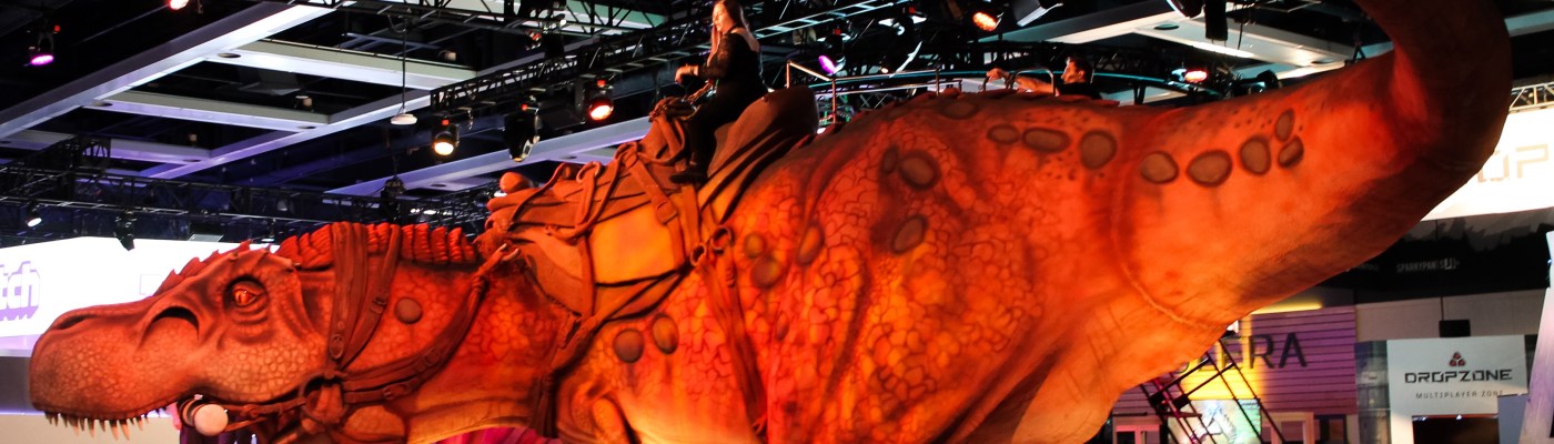 The best booth of the show is definitely the one promoting ARK: Survival Evolved, where attendees may go up a staircase and mount a large dinosaur.