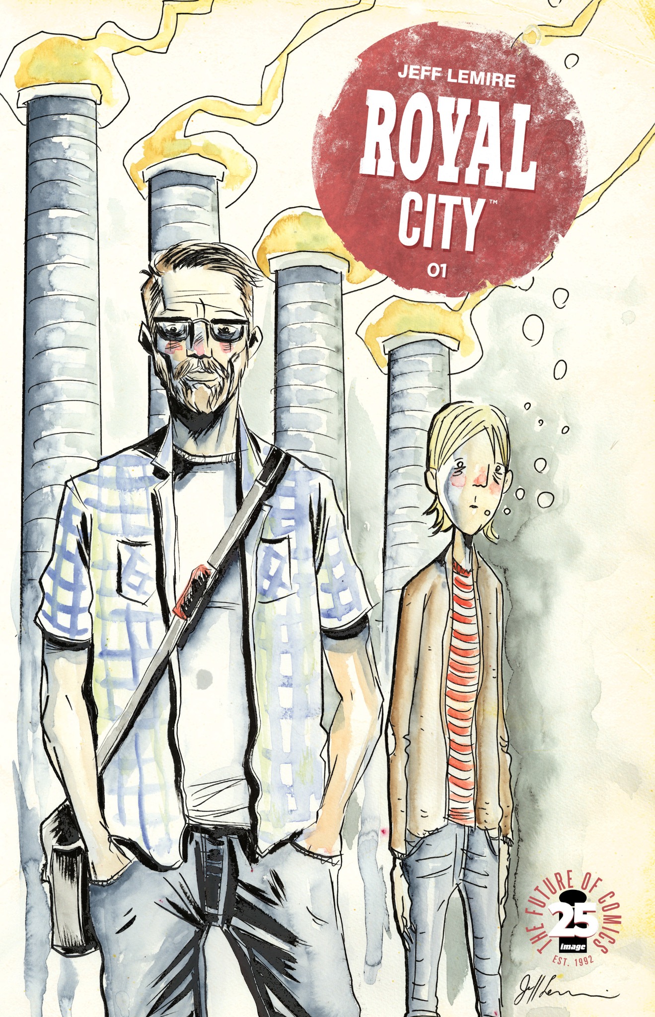 “NEW ONGOING SERIES written and illustrated by JEFF LEMIRE (DESCENDER, A.D., Sweet Tooth). ROYAL CITY charts the lives, loves, and losses of a troubled family and a vanishing town across three decades. Patrick Pike, a fading literary star who reluctantly returns to the once-thriving factory town where he grew up, is quickly drawn back into the dramas of his two adult siblings, his overbearing mother, and his brow-beaten father, all of whom are still haunted by different versions of his youngest brother, Tommy, who drowned decades ago. ROYAL CITY is a return to the literary and thematic territory of LEMIRE’s breakthrough graphic novel Essex County and is his most ambitious, and most personal project to date.”