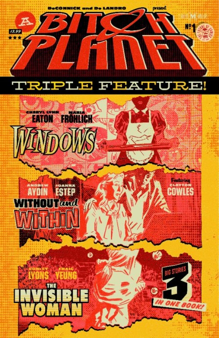 Bitch Planet: Triple Feature #1 will feature “Windows,” by Cheryl Lynn Eaton and Maria Fröhlich; “Without and Within,” by Andrew Aydin and Joanna Estep; and “The Invisible Woman,” written by Conley Lyons with art by Craig Yeung; all with lettering by Clayton Cowles.