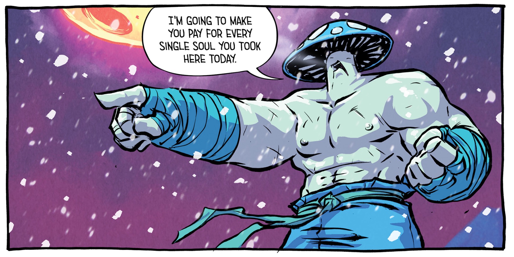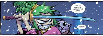 The art of Skottie Young is as supreme as his storytelling. But this issue, he plays a bit with the panels, trying for a bit of an anime style showdown with unnecessary banter and speed lines. The touch of snowfall and quick action also adds to the drama, giving a bit of the tense momentum felt from classic Japanese cinema fanfare. The design of the Shiitake mushroom warriors are also badass; more bold additions to the overall bizarre dreamlike fantasy.
