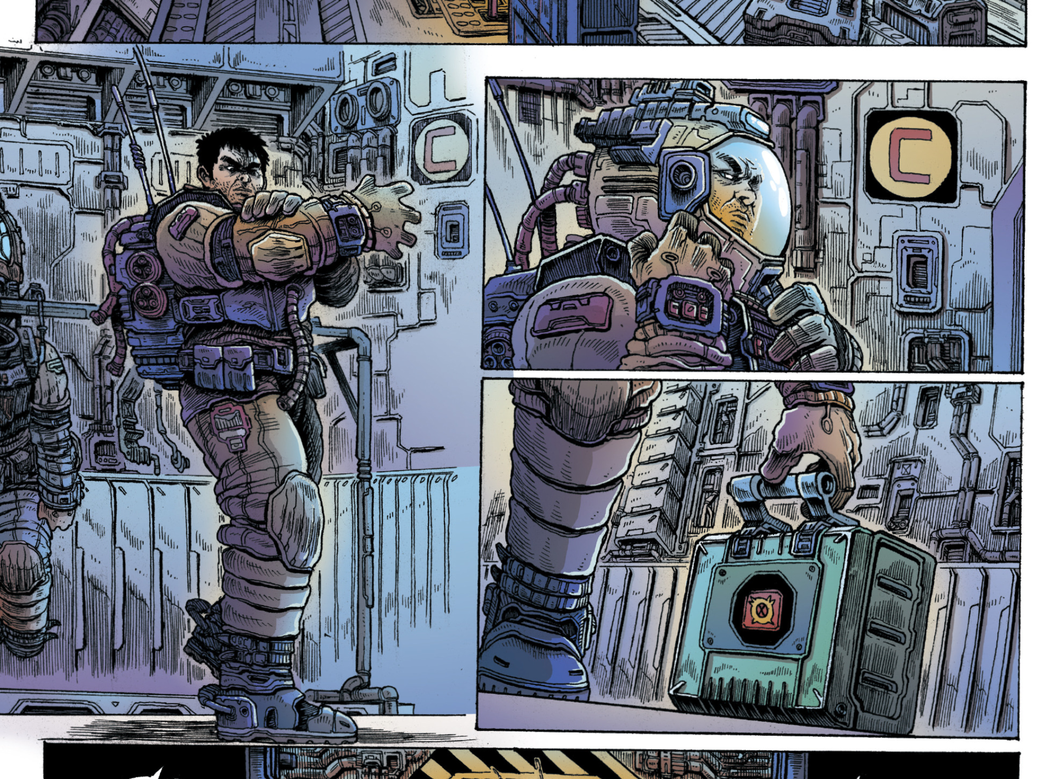 Reading forward, I am already lost in the art and how Stokoe integrates the storytelling in the visuals. The detail is incredible in setup, rich in sophistication and setting stage for a unique play that is based on a very familiar concept. The amount of work put into every console, corridor, tool, displays a forgotten futurism best remembered in old 90’s cyberpunk anime and early 80’s Heavy Metal comics. Adding to the detail, as some defining colors, setting the tone of this cold dead station against humanity’s light.