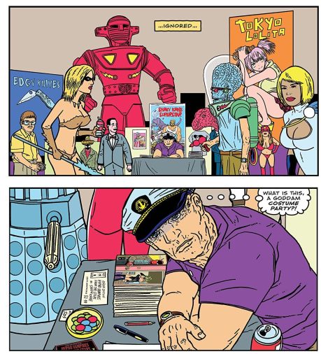 So forth, we get into the story with Shaky Kane, a veteran artist alone at his booth at a comics con. His view and reflection are of the past and present of the modern comic convention, he seems somewhat stuck in making ends meet. There is a bit of biography behind the scenes of this life and moving forward while separating himself from the writer. Such is an interesting experiment given that the actual writer based upon is putting out this story, drawn by the artist of the same name.