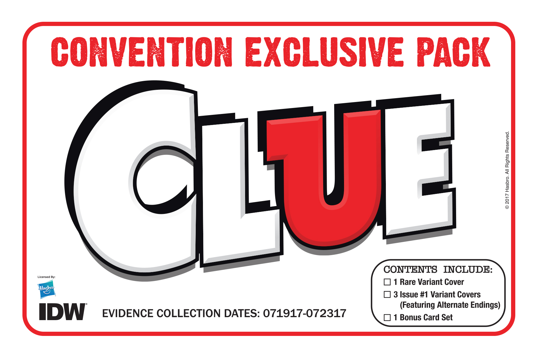 Follow the clues and solve the mystery in IDW’s new CLUE series! We’ve put together a special pack for this convention! We start with a RARE exclusive Gabriel Rodriguez Con variant cover, ONLY available in this pack, include all 3 regular editions with the alternate endings, and finish off with a full set of RARE Clue promotional trading cards, all tucked neatly into a Clue evidence envelope! All the familiar faces from the famous board game are back, with a couple new twists.