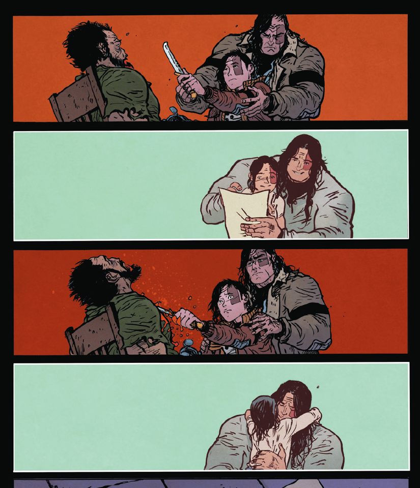 But then we cut to the present, and a very dark moment involving torture-based interrogation. It’s a sad, terrible scene of a man’s goodness stripping away at itself as the torturer, Jerome and it gets worse as he calls in his daughter Thea, now a little older and joining in the grisly act. There is a contrast of past and present, which works great with the panel composition.