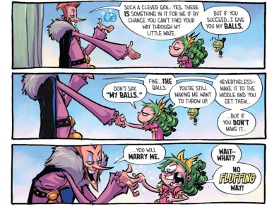 What follows is the usual fairyland silliness. Such is fun if you allow it, and there are smiling bits through various parts. Once again Scottie Young lets his style hang loose with all sorts of wacky, bizarre characters; and keeping Fairyland consistent as a colorful, sugar coated hellhole .