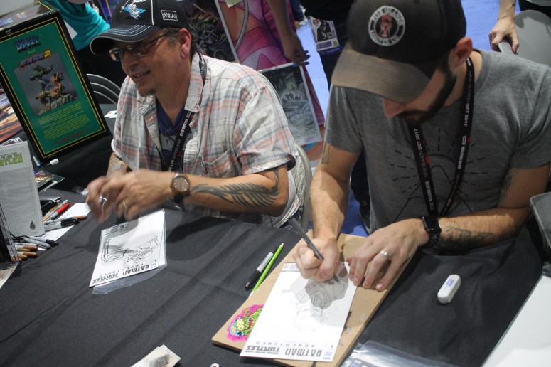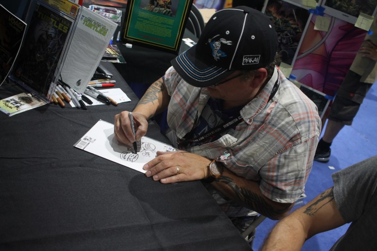 Kevin Eastman, co-creator of the Teenage Mutant Ninja Turtles, drawing his Heroes in a Half Shell for a fan.