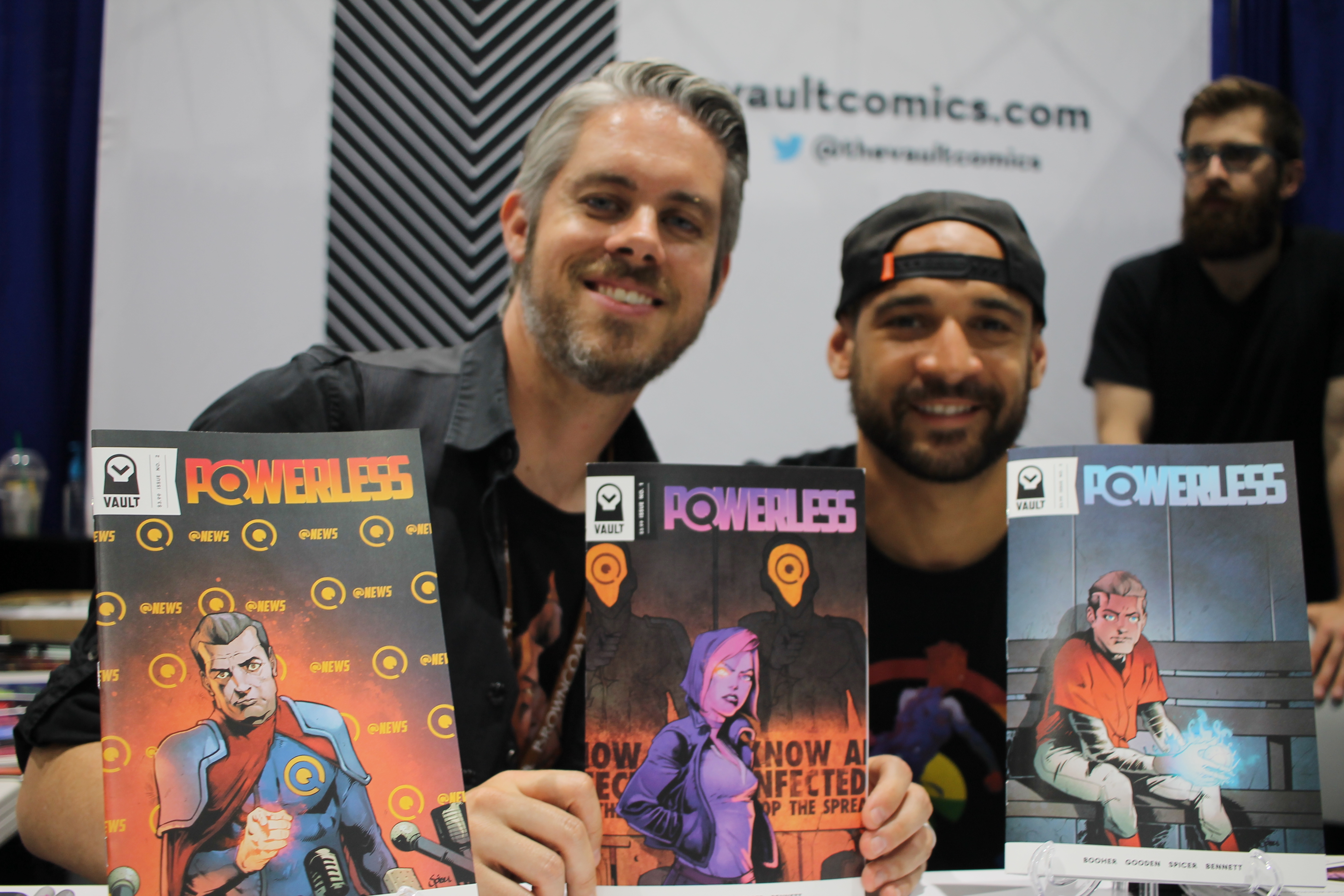 Writer David M. Booher and artist Nathan C. Gooden after pitching their proud work Powerless at the Vault Comics booth. Inside the series is a world where everyone has superpowers until a virus eats them away. You check out more on the series and Vault Comics here.