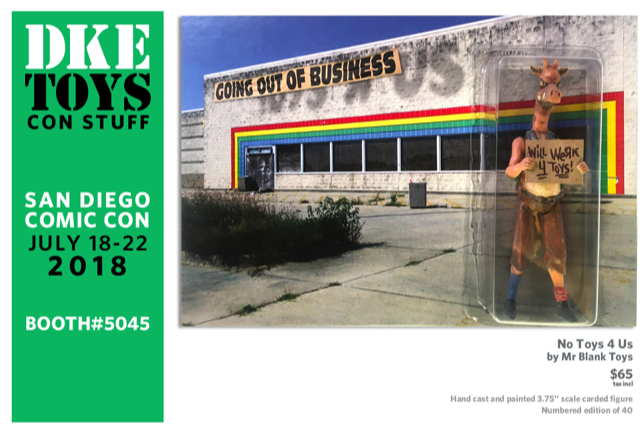 We’ve all be grieving the loss of Toys R Us, but no one as much as poor, sad, out of work Geoffrey the Giraffe. Mr Blank Toys in his SDCC debut brings No Toys 4 Us. Hand cast and painted 3.75” scale carded figure. Numbered edition of 40 pieces.