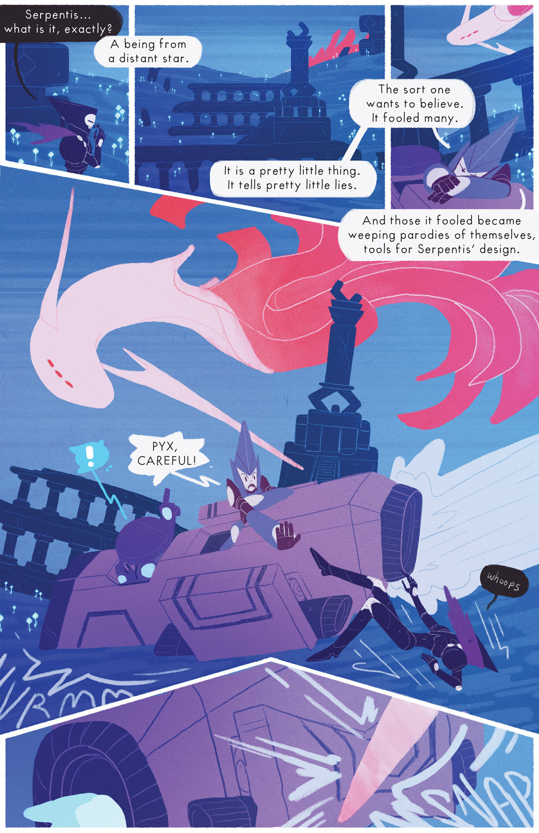 “Ophiuchus is a strange, personal project—it was based on a dream I had about trying to return home to a dead world, and confronting the ghost that was left of it,” said Leriger de la Plante. “We really went into it hoping to eventually turn it into a book one way or another, but we never quite expected the reception we got, and we almost lost our minds when Image decided to print it. We always felt the comic would be best in print, and that really went into every aspect of making it, so we’re extremely excited for it to reach a new audience in its intended format. The comic holds a lot of our love, so if you’re interested in loss, revenge, skeletons and robots, this is a comic for you.”