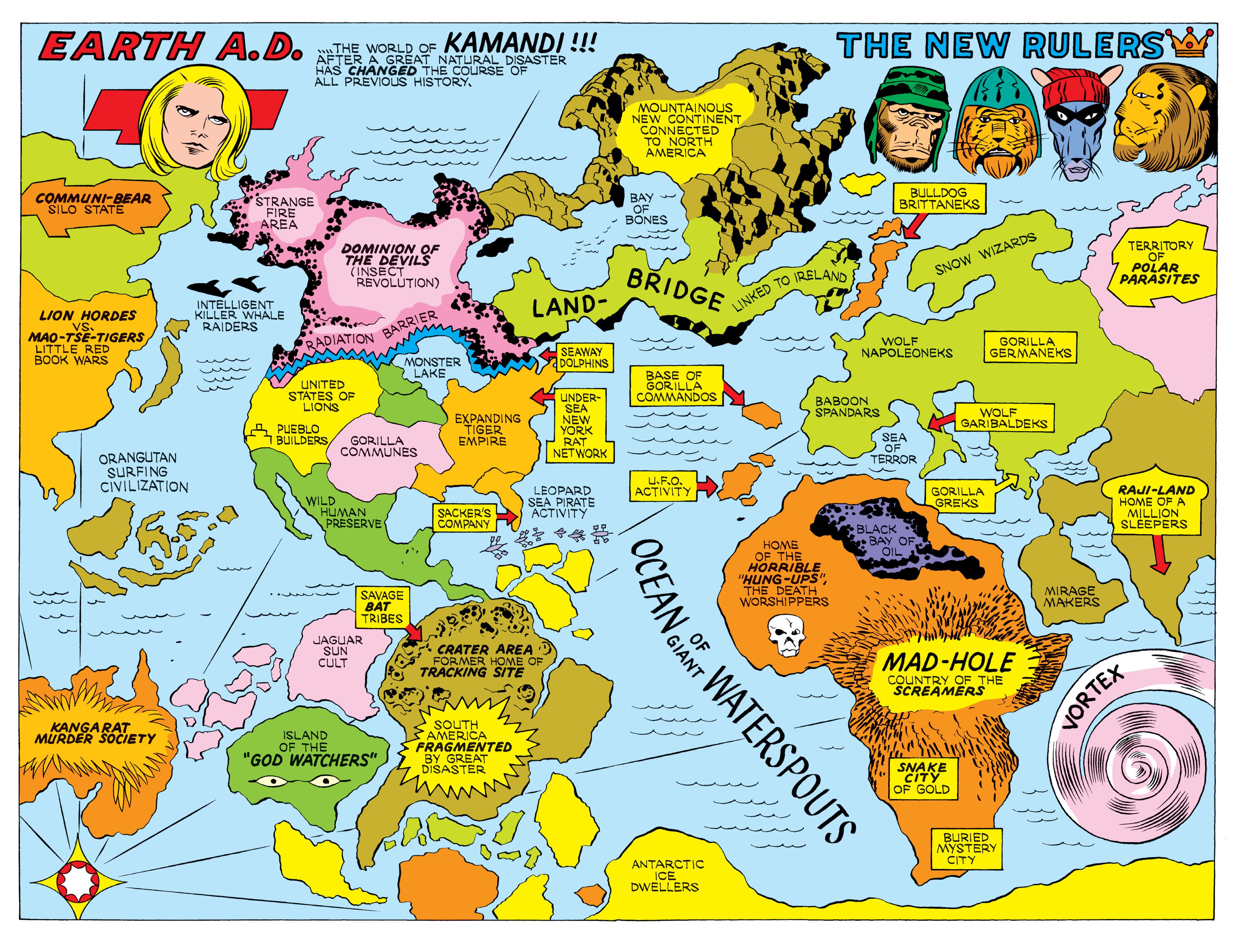 Anything is possible. But, often comes the focus of human prevalence, with a fascination held for the adaptation, though it can be very fantastically far-out.Mostly in agreement, is that the Earth will always change its face to fit the conditions of what we do. I present this fascinating map, produced by the extraordinary hand of Jack Kirby (with the inks and letters by D. Bruce Berry), from the comic book Kamandi: The Last Boy on Earth (#32) initially released in 1975.