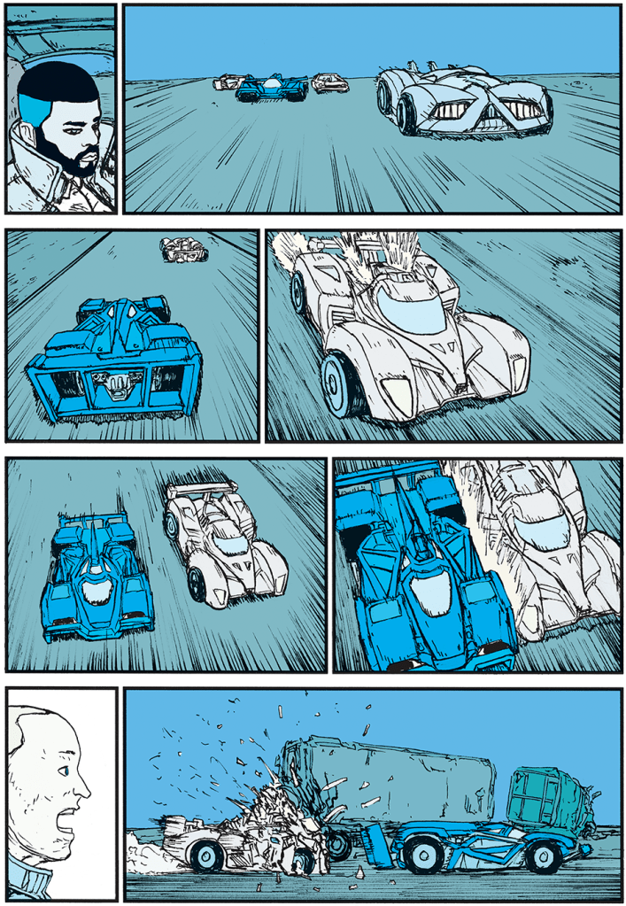 Here’s a preview of sample pages from break: Run. Nima Afshar offers a larger preview of the first 24 pages at threefoldcomics.com.