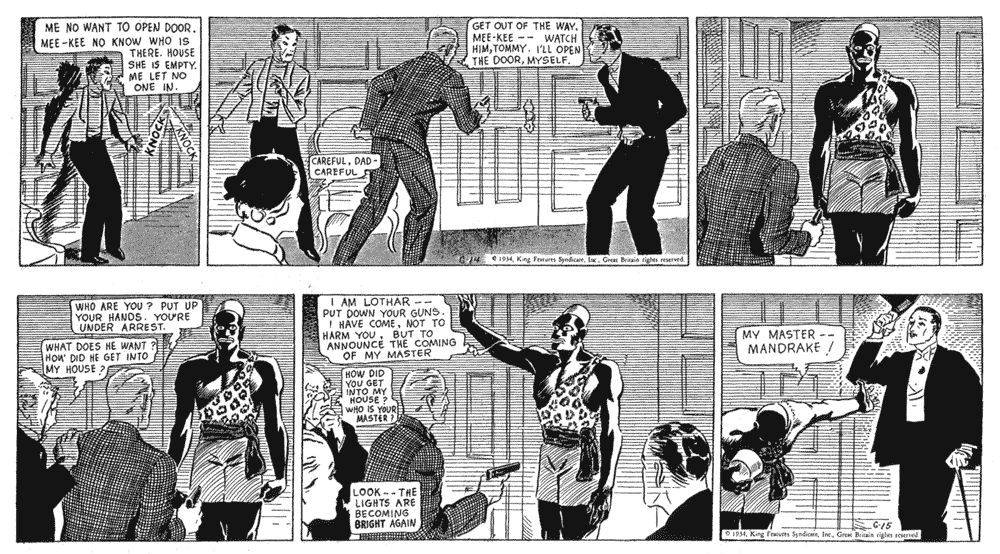 The first Black superhero to hit the niche pop culture of early comic books appeared first in 1934 in the Mandrake the Magician. daily newspaper strips. Lothar is Mandrake’s best friend and crimefighting companion, also an African prince of the “Seven Nations” a fictional league of African jungle tribes. His super power was his mighty strength, stamina, and invulnerability to any weapons, and magic. his early appearances had him featured as a servant with poor English skills. His clothing choice was typical of such depictions of a mighty, yet very foreign African man at the time.
