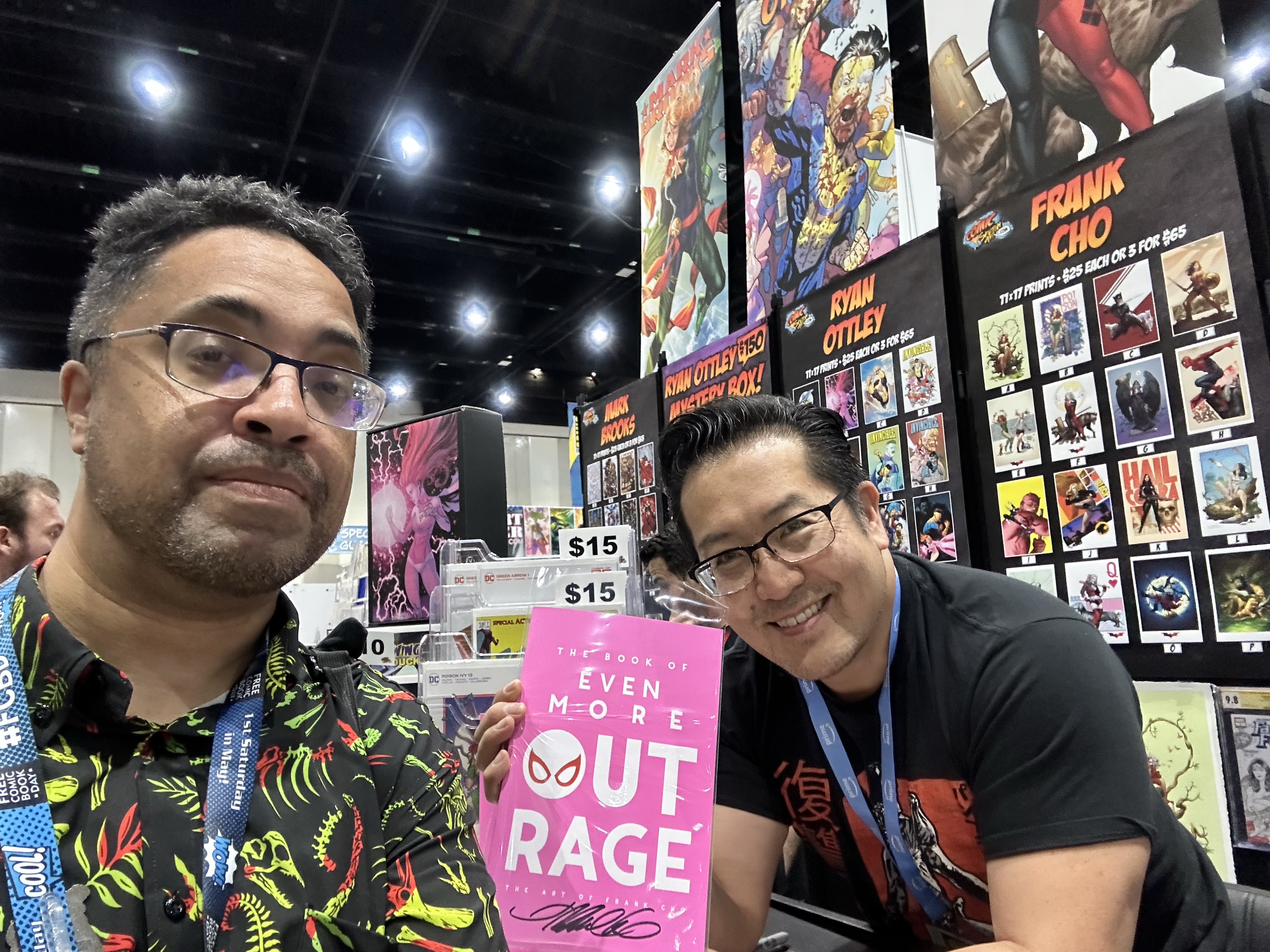 Some artists are open to paid commisions, and one of my favorite things to observe is seeing fresh art done live at a comic con. Ryan Odagawa takes a moment to politely pose for the camera, before continuing his latest work of the show.